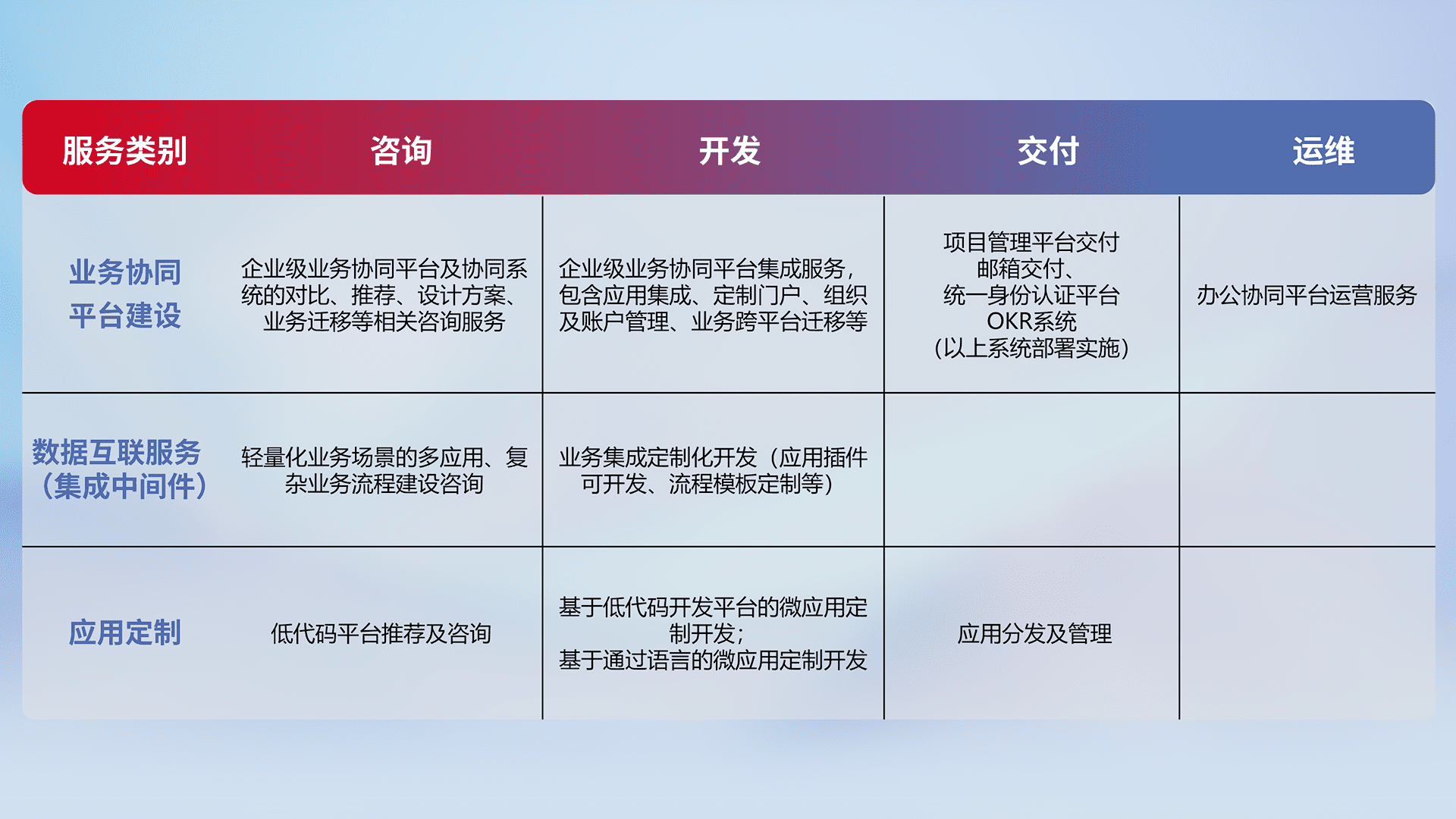 针对钉钉、、、企微、、IDaas等平台级产品提供产品的规划、、方案、、、、交付、、定制化开发等服务,,,,实现如统一协同办公、、智能客户服务、、、混合会议管理、、智能数据查询、、、等业务场景,,实现数字化转型。。。。