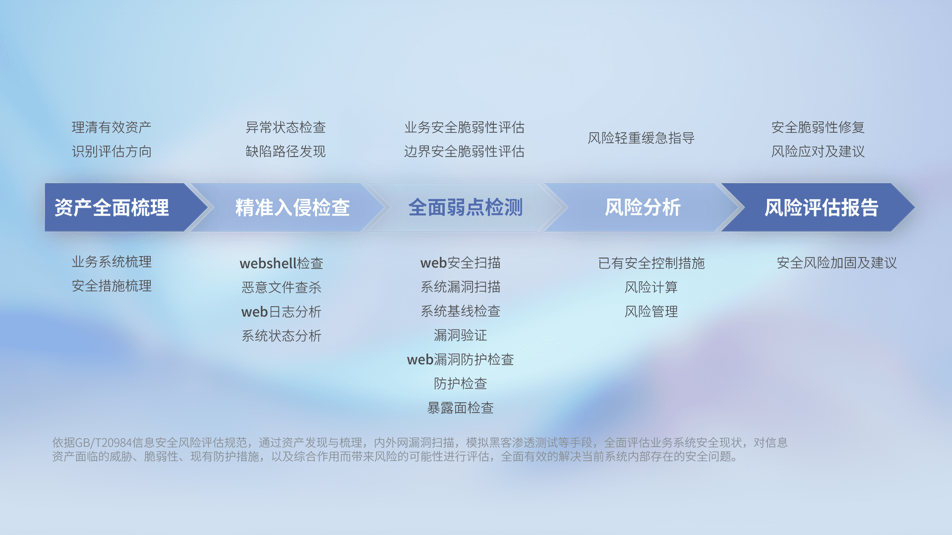 针对客户行业特性,,,以专业的安全服务+多厂商联合解决方案提供专属的一站式安全管理服务,,,帮助客户全面感知网络空间威胁,,,,基于识别、、、检测、、、分析、、、防护、、、监测、、、、响应的服务理论模型,,,从方案咨询、、、、集成交付、、评估验证、、优化加固、、、运维运营,,,致力于为客户提供完整的闭环管理式安全服务。。。以实战经验为客户打造高抵御风险的安全体系,,,帮助客户发现威胁、、、、对抗威胁、、、处置威胁,,,,不断积累安全对抗能力,,持续保障数字化安全。。。